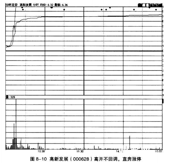 高新发展( 000628)(图8-10)跳空开盘后,多头攻击力量强大,投资者对该股前景看好,愿意以高于昨日收盘价格买入。