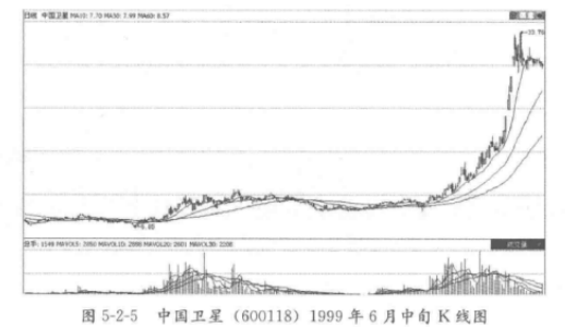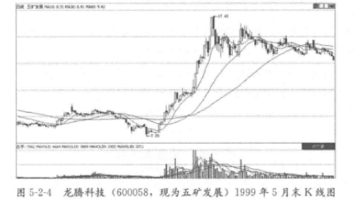 如图5-2-4,较长时间的熊市使该股股价一再下挫,1999 年5月初又出现了一个中阴线,使其股价再下一个台阶。就在这个时候,5月19日,该股以7. 49元的价格开盘,不过它没有重复往日波澜不兴的走势,开盘价为其当日最低价,随后股价一路攀升,最终以涨停板报收。