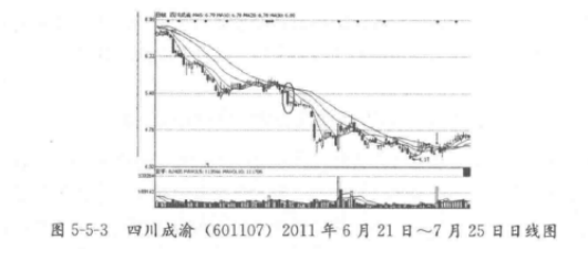从图5-5-3中可以看出,该股2011年6月21日~7月21日之间经历了一个月的横盘整理阶段,7月25日当天,该股出现跌停板,但此时绝不是买入的时机。该股处于下降趋势中。