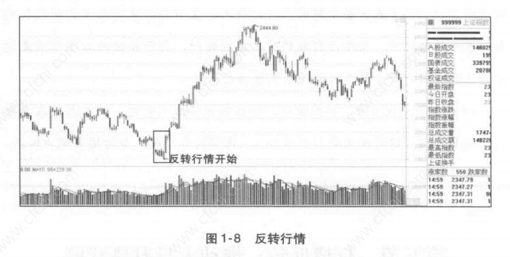 反转行情是指市场的整体下跌趋势发生根本性扭转,股市重新步入牛市,股指将出现超越前期高点的强势行情。这种反转行情在历史中重现过多次:1992年放开涨停板制度,1994年股指跌到325点时管理层发布三大救市政策,1995年5月18日宣布暂停国债期市,1996年年初形成的反转行情,1999年的“5.19行情”。