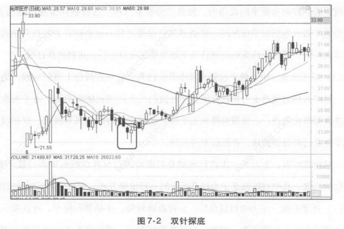 (3)双针探底。该方法与金针探底大同小异。顾名思义,就是在一定的间隔时间内出现两次金针探底,并且量能都有效放出,并且双针探底的位置能够保持平行,更能证明原投资者持有筹码的稳定性和下档踊跃的承接力(图7-2)。
