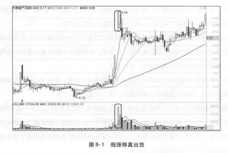 实战中,炒作手法高明的少数市场主力往往以涨停板为幌子,达到顺利派发、套取大量现金的目的。当某只股票连续一段时间暴涨后,主力用大笔买单封住涨停,吸引许多中小散户跟风以涨停价格排队等待买入。这时眼见买人者众多,主力迅速申请撤单成功后,便开始全力出货,大量抛售。涨停板被打开,由于买入者众,主力不愁找不到买主,迅速达到出货的目的(图8-1)。