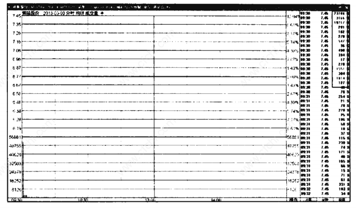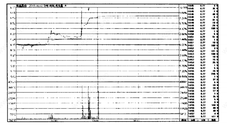 从辉隆股份右上方分笔成交明细中可以看出,在开盘之后1分钟时间里,在开盘后的涨停价有大量成交出现。这就告诉我们,要是投资者能够较早以涨停价委托买入。从当天的情况来看。是极有可能买得到的。在本节最前面就讲述了应该在何种情况下以涨停价来提前委托买人,以及为什么要在9;15开盘价还没有出来以前就要以涨停价委托买入。在这里就不再赘述了。
