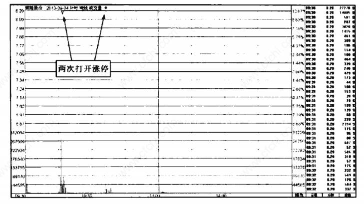 其实,在实际的操作过程中,由于此种涨停拉升的速度过快,投资者就是想去在首次冲击涨停时买入往往也很困难的,因此,不管是从规避风险还是现实的操作角度来说,对于此种形态都只能在涨停打开之后,等到再次封于涨停时考虑介人更好。