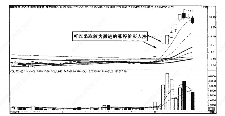 而且当天极可能会收出一字涨停的K线形态,那么,就可以采取在涨停价进行委托买入的方法。该法要求投资者对题材的理解分析能力要很强,对超短线技能的要求也很高,因此,若非短线高手应该慎用此法。