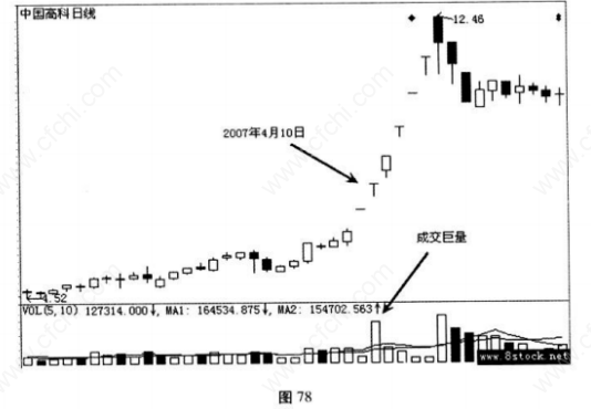 该股2006年底开始盘升,到2007年4月,股价早已经翻番,短暂洗盘后,4月3日开始快速拉升,4月10日已经到了7.73元(还权),获利盘累积太多,但当时正处在疯狂的大牛市阶段,庄家不想浪费时间,必须依赖高涨的市场热情-涨到底。