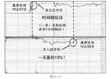 图14-11中显示的是两只特殊性涨停的股票:上面是一只凸字形涨停板的股票,下面是一只凹字形涨停走势的股票。如果我们单独把它们分开了看,似乎没有任何联系,但是把它们放到同一天的走势中来对比看的话,就会发现它们两个的走势正好是一个不错的“时间错位法”操作的对象股。