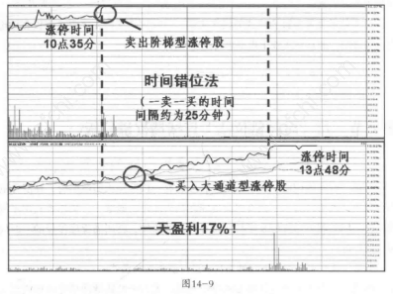 我们看到,在图14-9里,上面的一只股票是阶梯型涨停板,下面的一只股票是大通道型涨停走势。一般这两种走势的股票可以在时间上错开来,因为大通道型涨停几乎全部是在下午出现,而阶梯型涨停至少有一半是在上午出现的,这样就给我们在一天内连续捕 获涨停的股票创造了时间上的条件。