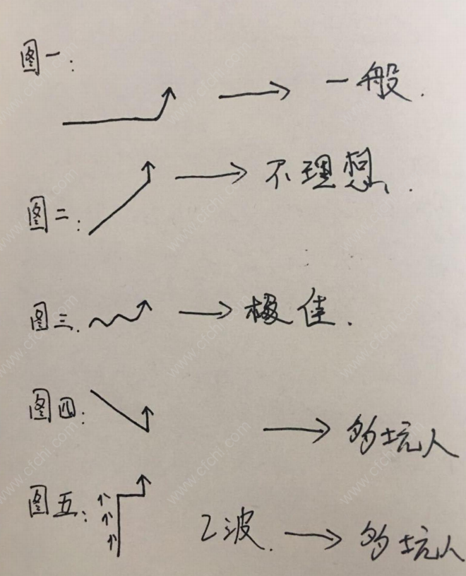 我大致手绘了5种,其中第三种极佳,除了其K线图之外,我们还要迅速的在3秒内瞄一眼其CCI+KDJ+量比,KDJ最重要,80左右就可以了。但如果你看到了极佳的图形加题材的股票出现,没有时间去深究其KDJ+CCl,也