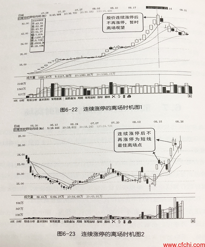 如图6-23所示是新开源(300109) 的日K线图,图中显示该股有两次连续涨停现象,但两次均以不再涨停为最佳离场点, 因为每次不再涨停后股价都出现了不同程度的回落,可见此操作建议是具有一定普遍适用性的,望读者能认真体会并加以运用。