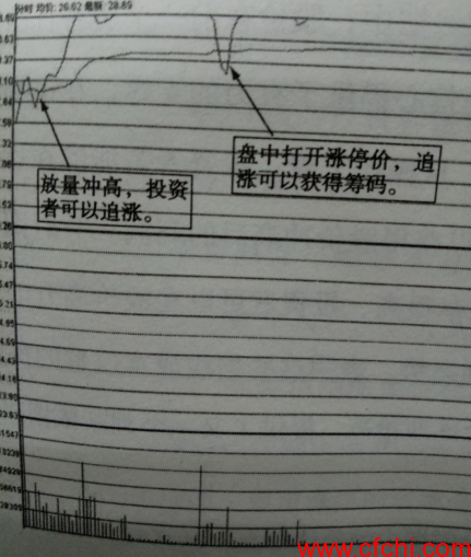 如图1-5所示,分时图中的重要介人时点,在于该股被拉升至高位的回调阶段,以及盘中打开涨停价阶段。这两个位置都可以成为投资者追涨的机会。 考虑主力拉升,股价会在很短的时间内涨停。投资者追涨的价位必然要高于连续竞价的买入价位,才有可能获得足够的筹码。