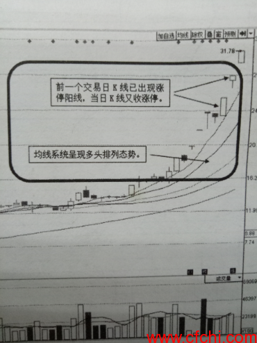 如图1-3所示,在中国北车(601299)日K线图中,股价在前一个交易日已经出现了一个涨停阳线,其为投资者后市做多的信心提供了有力的支撑,在市场情绪高涨的情况下,股价后市走强的概率极大。从操作上看,投资者若能够在这个位置上追涨,买人筹码的价位较低的话,可以获得股价冲高后的利润。分时图中涨停效率很高的个股,第二天高开上涨的概率很高,投资者可以在股价高开的时候做空获利。另外,均线系统呈现多头排列态势,表明这些均线成本位置的投资者后市看多,也为股价后市向上运行,股价逐渐抬高,提供了又一个判断依据。