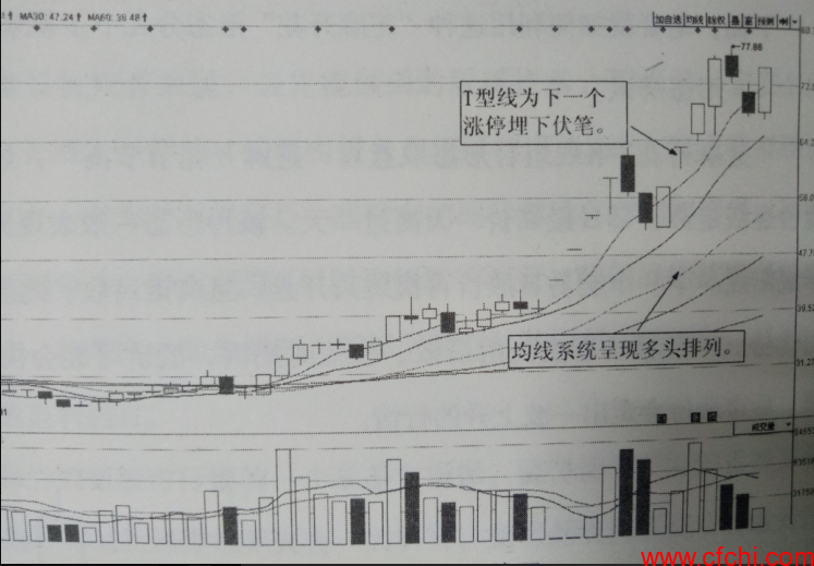 如图1所示,在久其软件(002279)日K线图中,该股股价处在一波上升行情中。经历了短暂的回调之后,在一根光头光脚涨停阳线的提振下,股价又迅速拉升。“T”型线为下一个交易日的涨停埋下了伏笔,同时也形成了“芝麻开花”形态的雏形。均线呈现出多头排列的态势,为股价的继续上涨提供了支撑。此形态往往预示着后市股价会加速上扬,且可能走出涨停板。在股市上涨的途中如果出现这种形态,常常是投资者介入的时机。