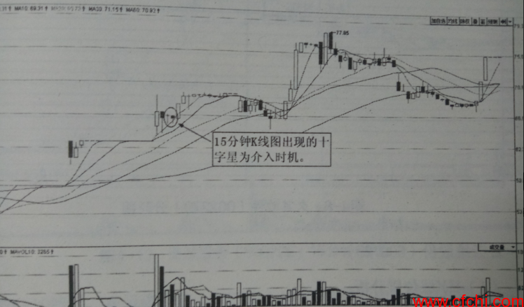 如图2所示,在久其软件(002279) 15分钟K线图中,股价所表现出的K线走势直处于上升态势中。在这一过程中,有时候股价会处于“一”字形态,而在该种形态下,投资者介人获得筹码的可能性非常低。因此,投资者应密切关注其他K线走势,以寻求买点。我们看到,该股股价出现了十字星走势,若结合其所处的位置进行分析,则可以得出此时为介人的好时机。