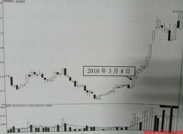 从当日之前的K线走势图可以看到,此股正处于持续回调后的相对低位区,短期内有较大的上行空间,因而,在实盘操作中,可以在盘口中判别出这种形态后及时追涨买股。虽然当日的买人成本相对较高,但是从日K线图上来看,这一价位并不高、处于中期低位区。而且,个股当日启动信息明确,买人操作可以说是顺势而为,并非盲目的追涨操作。如图2 标示了此股在2010年3月8日前后的运行情况,可以看到,在主力资金的强力运作下,此股的短期涨幅巨大,而2010年3月8日盘口中出现的这种“开盘量价齐升冲涨停”的走势就是个股启动的明确信号。