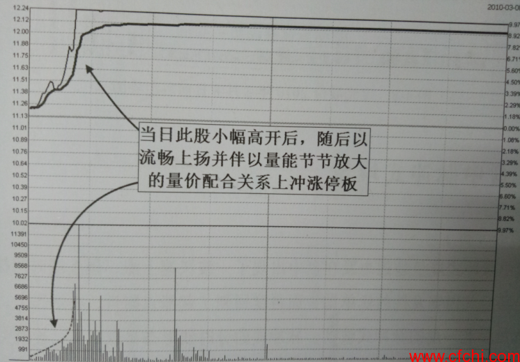 如图1所示为宝光股份2010年3月8日分时图,当日此股小幅高开,随后在买单不断人场的推动下而流畅上扬,在快速上扬时,分时量不断放大,而且,个股在大买单的推动下开始向上冲击涨停板,这就是“开盘量价齐升冲涨位”的公时图 诗种分时图是主力资金强势拉升个股的信号。
