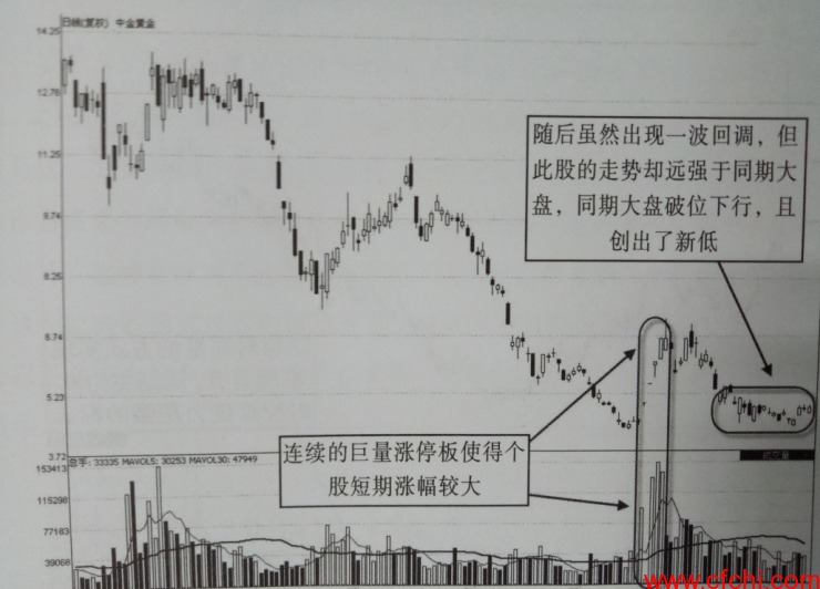 如图2所示为中金黄金2008年4月至11月期间走势图,此股在低位区因黄金题材而出现了这种“连续巨量涨停+相对缩量回调”的量价配合形态。虽然此股回调的幅度相对较大,但这与同期大盘破位下行、再创新低的走势有关。如果进行对比,此时在连续巨量涨停板后的回调走势其实远强于同期大盘。这种盘面形态同样也是主力资金借助于利好题材面而对个股实施快速的拔高式吸筹行为的体现。预示着个股底部区的出现,也预示着趋势将反转上行。