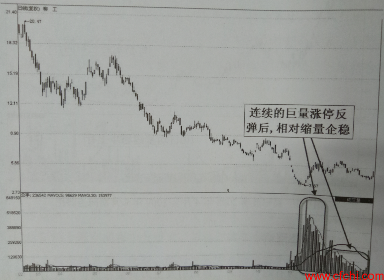如图1所示为柳工2008年2月至2009年1月期间走势图,此股在深幅下跌后的低位区因受国家同期出台的“四万亿经济刺激方案”提振,而成为了市场关注的热点题材股,这引发了主力的快速大力度吸筹。个股连续出残冻停板、短期内涨幅较大, 并且这些涨停板都放出了巨量,这说明有资金在大规模介人,这正是主力资金。随后,个股在短期快速上涨后的高点企稳,这意味着有自己在积极地承接。通过这种线连续巨量涨停.再相对缩量企稳的量价配合关系,结合此股同期的题材面,股民可以很好的把握主力此时的吸筹操作。