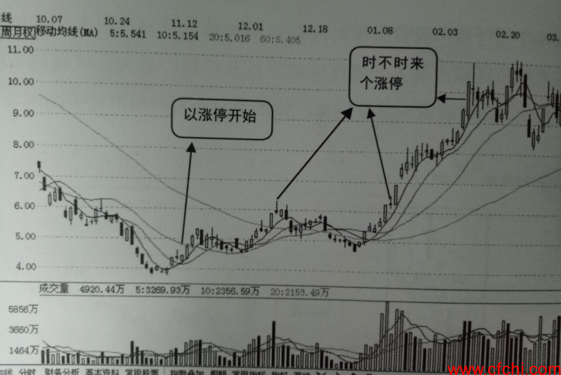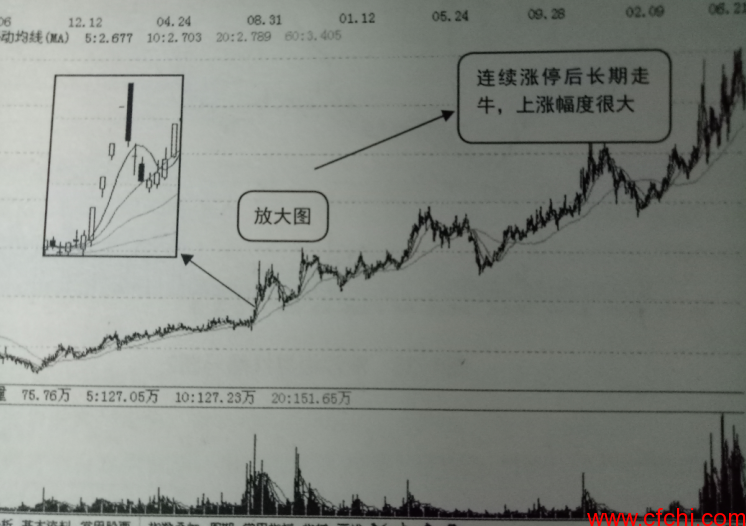 (2)股价在底部区域时不时就会出现涨停板,表明股价活性很强,庄家对股价上涨信心很足,之后股价便步入长期牛市,上涨幅度往往更加惊人,就是所谓的超级大黑马。