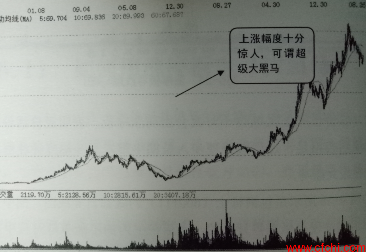 如图3所示为该股的整体日K线图,图中显示该股自底部起出现长期牛市行情,股价最高上摸80元附近,而再看图3所示的底部区域股价只是几元而已。可见该股上涨幅度很大,且持续时间长,可谓千古难遇的超级大黑马。如果你能在该股底部发现涨停板的特点可能该黑马就属于你了。