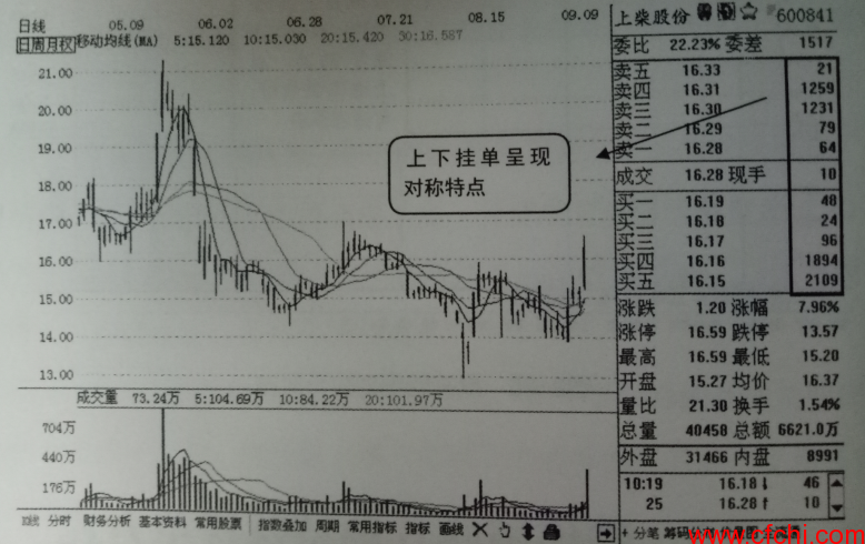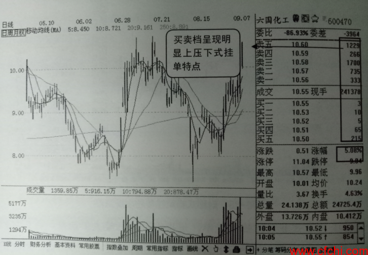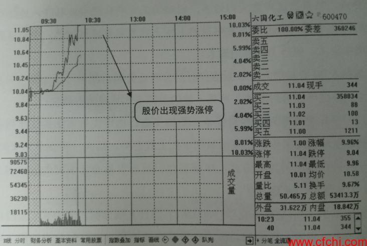 如图3所示是六国化工的K线界面,图中显示该股当天当时已经上涨5个百分点,且外盘比内盘大得较多,已知当天农药化肥板块领涨,另外可观察到当时的买卖档已经出现非常明显的上压下式非对称蜂窝挂单,说明该股当天法停概率很大,操作上可适当追入。