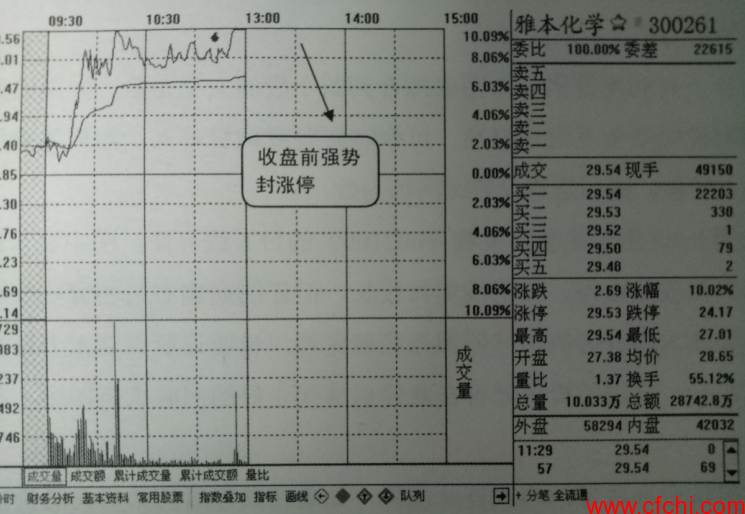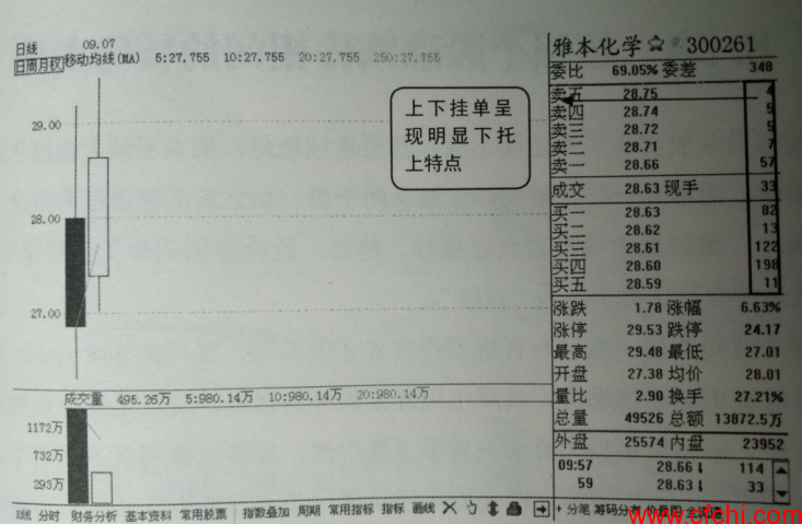 如图5所示是雅本化学(300261) 的日K线界面,图中显示该股属于刚上市第二天的新股,且为创业板,在当时炒新情绪高胀和创业板行情尚可的大背景下,当天当时该股已经上涨6个多百分点,且整个上涨态势保持良好,同时可观察到该股的买卖档挂单呈现明显的下托上式挂单特点,说明该股当天涨停概率比较大。