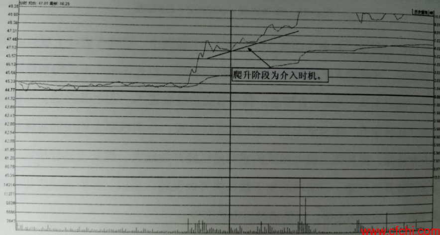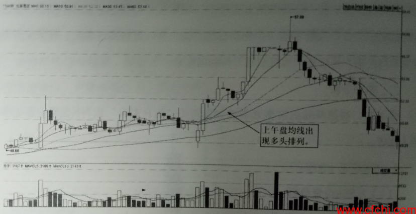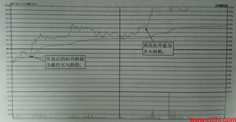 如图7所示,在奥飞动漫(002292)分时图中,股价在开盘后表现平平,一直处于横盘整理的状态,直到午盘时才开始进人爬升的阶段。若投资者想要在当日追涨,其买人的机会是非常充足的。但考虑到开盘后,股价的强势上涨态势尚未确立,投资者很难判断股价的走势,那么午盘股价拉升的阶段就变得非常重要了。结合该股的日K线图中出现的“旭日东升”形态,应确定股价在短期内会进人上升阶段。投资者应把握时机,果断介人。获得筹码后,在股价第二天冲高后做空获利。若股价继续保持强势上涨,可短线持有,如此可在短期内获得丰厚的回报。