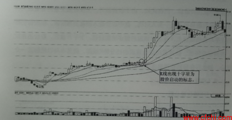 如图6所示,在奥飞动漫(002292) 15分钟K线图中,股价在经过一段横盘整理之后,出现了两个“十字星”的K线走势。这表明多空双方的力量处于均势,但这种均势状态并不会持续很久,随时有可能被打破,而出现行情的反转。投资者应结合日K线组合之前出现的“旭日东升”组合作出判断,在股价出现反转向上时果断出击,以期能获得短线旅停的收益。