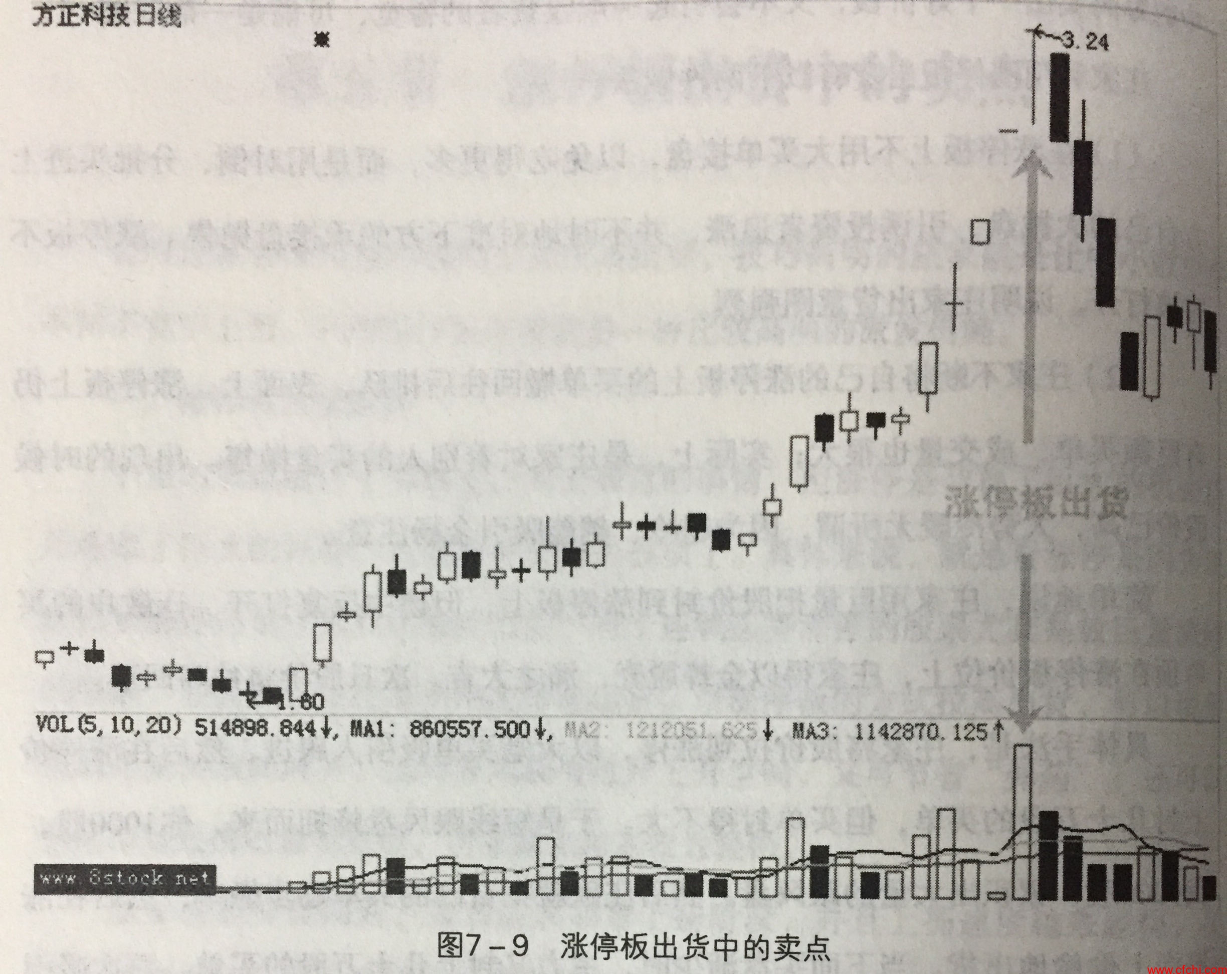 图7-9是方正科技的K线走势。图中箭头位置列示出该股-开盘庄家便将股价封至涨停,然后引诱散户挂买单, 庄家趁机撤买单挂卖单,把大批筹码都甩给了抢进者,K线图上可以看到涨停中途曾被打开过,成交量达00多万股,当日收盘虽然又封至涨停,但第二日一开盘股价便跳空下跌。这就是庄家利用涨停板成功出货的例子。