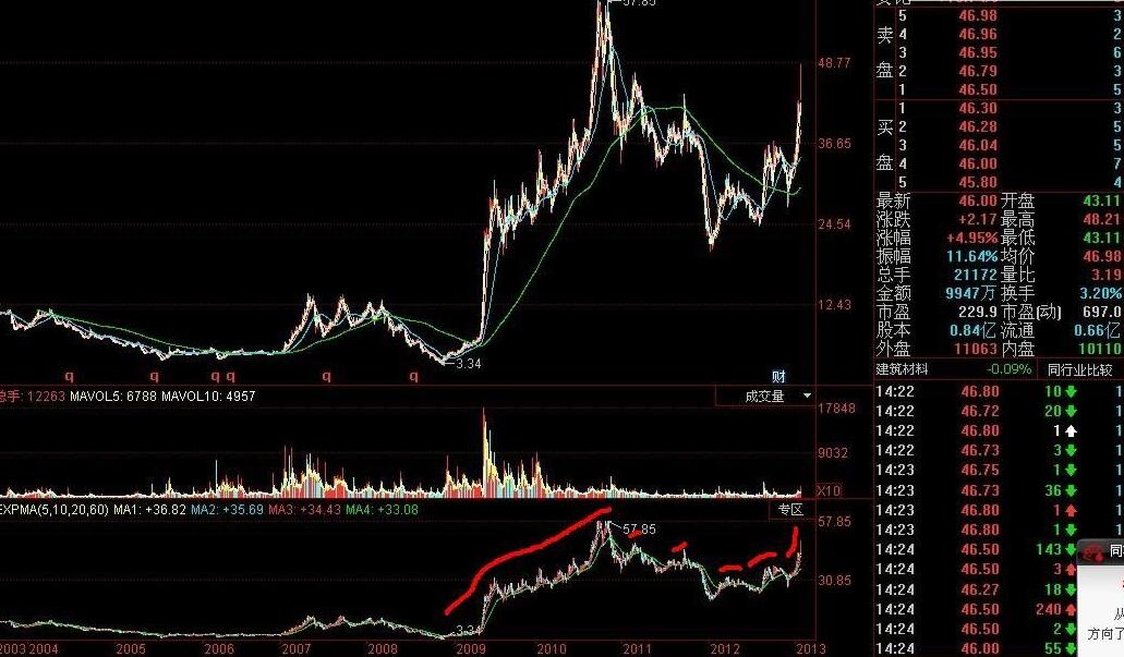 上图为上证指数在运用EXPMA指标下,满足多头形态可以考虑买入股票的时候。可以明显看出,06年、07年一直是连续买股持股阶段,08年一路没有操作机会,而近一两年操作机会都是寥寥无几。(画红线的地方为可以做多的机会)
