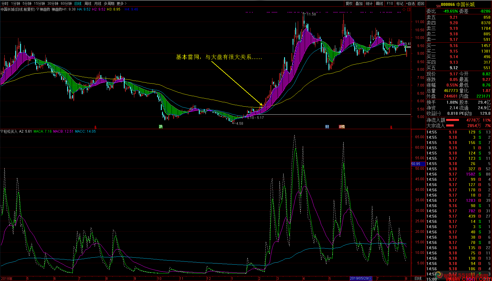 这个主图简单明了,一看就知道怎么用。K线上空牛熊轨道时黄色柱子提示“买入”,红线持股,蓝线持币,蓝线提示“卖出“信号,波段操作简单明了,轨道之下就是熊市区,牛市区拿稳手中票,熊市区放心玩。
