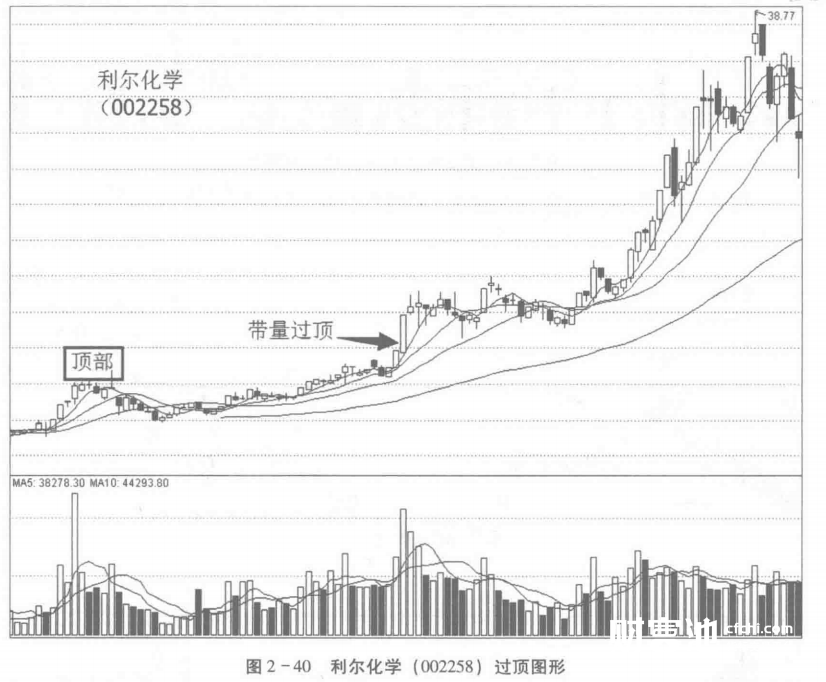 图2-40是利尔化学(002258)2015年1月到2015年6月的K线截图。该股在方框所示区域形成一个阶段性顶部,经过较长时间盘整后,后期出现了一个带量过顶的走势,此后走出一波主升浪。