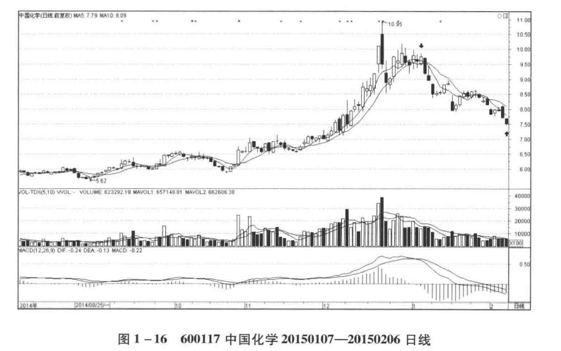 根据第一买点操作系统的要求,寻找在日线图中能够清晰划分出下跌+横盘+下跌的下跌走势类型,如图1-16所示: