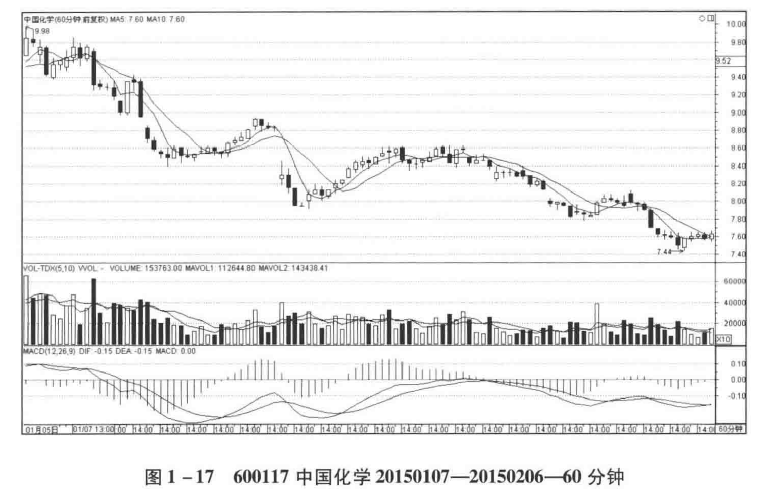 在30分钟与60分钟图中,无论是从均线还是MACD 黄白线、红绿柱高度、红绿柱面积,都可以明显地看出5—6相对于1—2段背驰。考察5—6段内部,同样由三段走势构成,其中第三段与第一段下跌形成背驰。这时就可以确定,5—6段下跌的低点将出现这段日线下跌走势类型的第一买点。