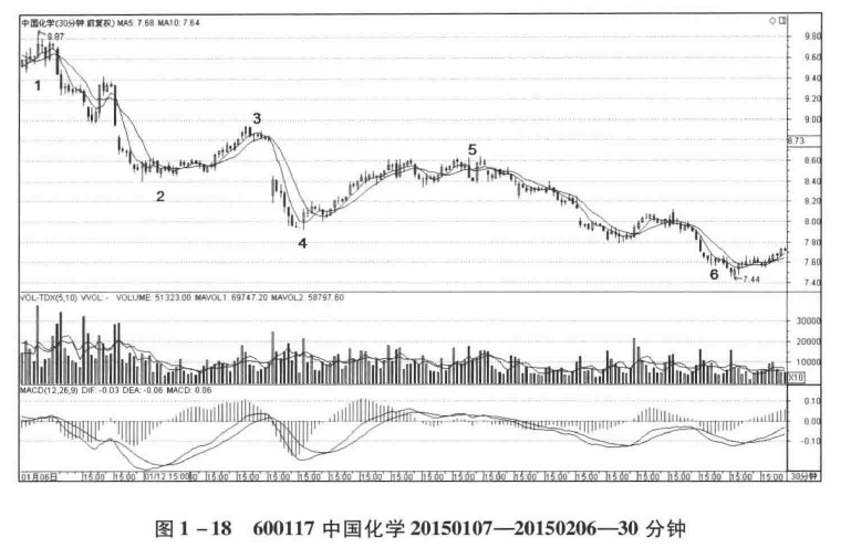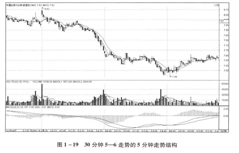 对于买点精确位置的考量,还可以通过分解5—6段的次级别结构而得。在图1–18的 30分钟走势图中,可以明显看出5—6段的第三段下跌有着次级别的三段结构,考察如图1-18、1-19所示: