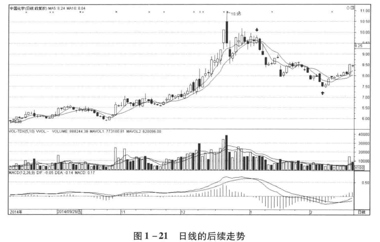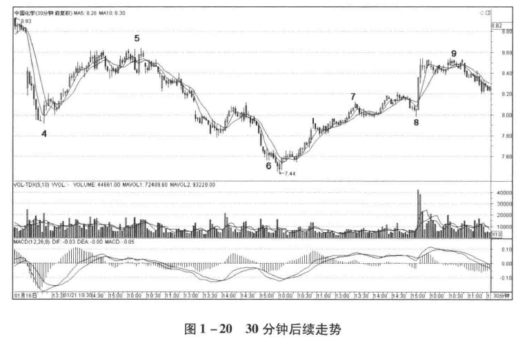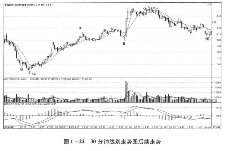 在日线图中,由于截至最后一根十字星K线,均线还没有交叉,而根据走势必完美,后续走势的均线一定会至少靠近一次后再上涨才能结束,所以从向上箭头处到十字星,一定是次级别或者次级别以下级别走势类型。在图1 -20 30 分钟后续走势中,6—9走势,就是日线上从向上箭头处到最后一根K线的内部结构。
