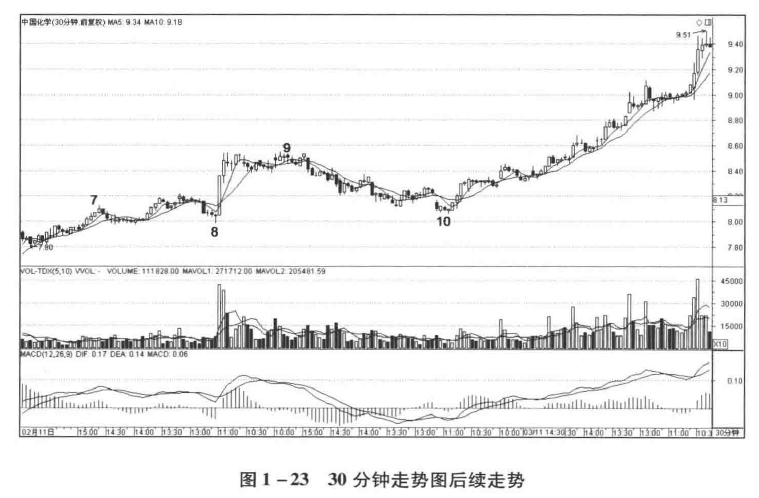 从9到10,完成了第二段30分钟走势,从图1-22中看是下跌,并且均线两次交叉,构成次级别盘整,同时在10的位置构成9—10的第一买点。根据走势必完美,后面一定还有一次上涨,所以在9—10的第一买点再次介入。后续走势如图1-23所示。