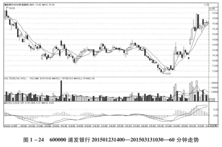 从16.03到13.51构成标准的60分钟级别下跌走势,并在13.51处形成图中的第一买点。最后股价上涨到横盘区域之中,并展开盘整,使均线黏合。这样就形成了标准的以盘整为形态的第二买点。