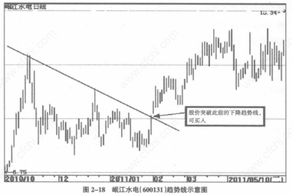 如图2-18所示,岷江水电(600131) 于2011年1月28日,股价成功突破了之前的下降趋势线。这种现象具有短期的买人意义,表示股价可能会有一段时间的回升。