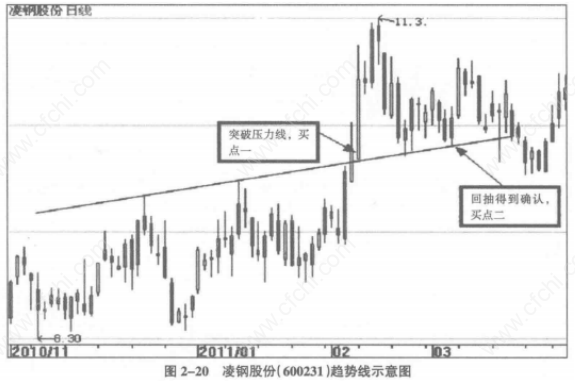 如图2-20所示,2011年2月11日,凌钢股份(600231) 突破压力线,此时可作为第一个买点;之后股价又像压力线靠拢,直到2011年3月4日的时候,股价再次获得支撑,得到短暂的突破,此时可作为第二个买点。