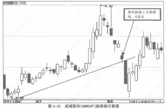 如图2-21所示,成城股份(600247) 在2011年6月21日到8月5日,走出了一段.上升的趋势。但是在8月5日的时候,该股股价跌破了这条上升趋势线,意味着该股股价上升空间已经较少,为了规避股市风险,最好立即卖出。