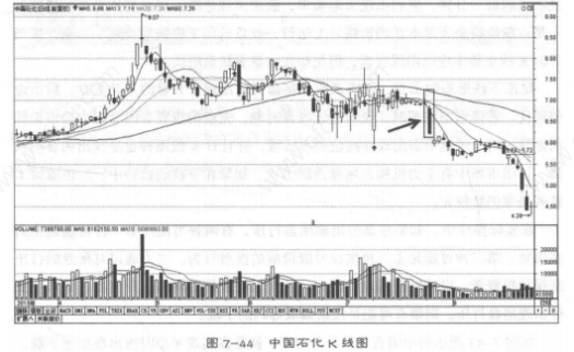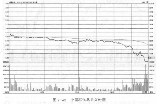 如图7-43所示的中国石化某日分时图,就是在尾盘半小时内出现加速下跌,直至以跌停收盘。从图7-44K线图中可以看到,该股前期已经处于明显的下跌趋势,而此时大阴线的出现,则对后市可能起到一个加速下跌的作用,持股者应该果断清仓,短期内避开该股。