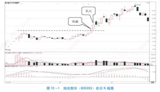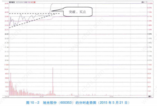 如图10-1所示,2015年5月20日,旭光股份以强势涨停的走势突破前期高点。这是看涨买入信号。当日涨停突破的形态确认后,随后一个交易日的盘中,投资者可以积极买入股票。