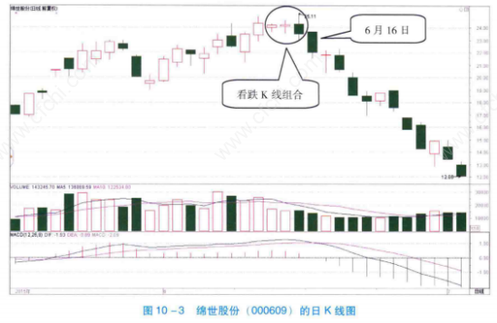如图10-3所示,2015年6月11~15日,绵世股份上涨至高位后,连续形成了两根小阳线,随后形成了一根长阴线,将这两根小阳线完全吞没。根据K线形态,这三根K线共同组成了一个看跌的K线组合。如果随后一个交易日股价继续下跌,投资者就应该抛出股票。