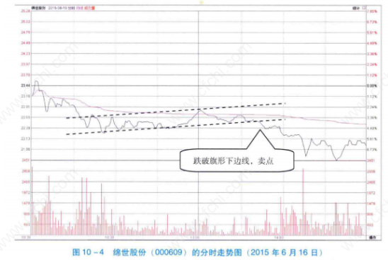 如图10-4所示,6月16日,该股开盘后持续下跌,当下跌至低位时获得了一定支撑,构成旗形整理形态。这样的形态说明下方虽然有支撑,但支撑的力量很弱,难以推动股价上涨。而旗形形成过程中该股持续萎缩的成交量,也可以证明这一点。
