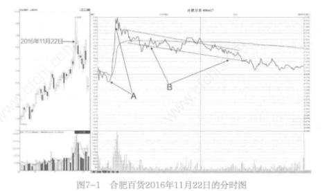 如图7-1所示,在合肥百货2016年11月22日的分时图中,A段的一波冲高虽然十分强势,但时间短,盘中高点无支撑,随后的盘中走势持续回落,再结合日K线图上的中短线涨幅大、当日放出巨量可知,当日资金出逃力度较大,是价格走势短线折转的信号。