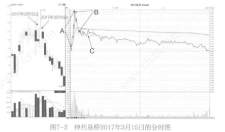 如图7-2所示,在神州易桥2017年3月15日的分时图中,A段的开盘放量快速上冲、B段直线下跌,正好构成了一个尖形反转形态。这是主力开盘后拉升出货的一种常见盘口形态。