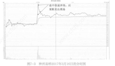 (4)图7-3标示了此股次日的盘口走势,该股早盘运行平稳,盘中再度出现飙升、高点无支撑的尖形反转。这是大盘走势稳健运行为我们创造的第二个卖出时机。