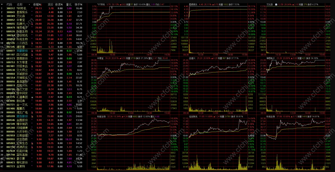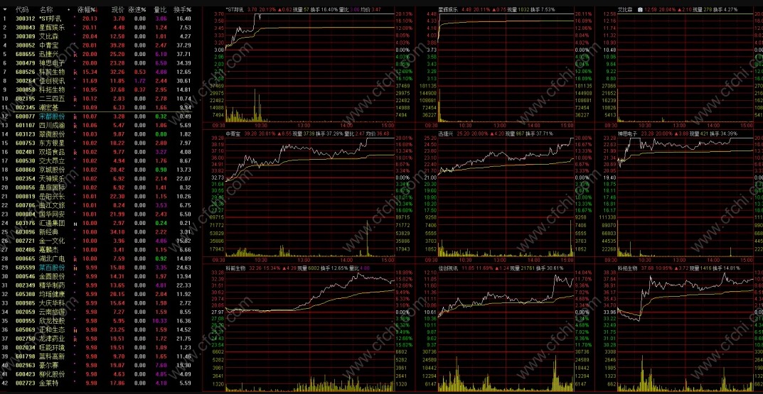 2、右侧可以看前 9 个靠前的个股分时图,能够让你结合爆发的量能找到爆拉反转的个股。