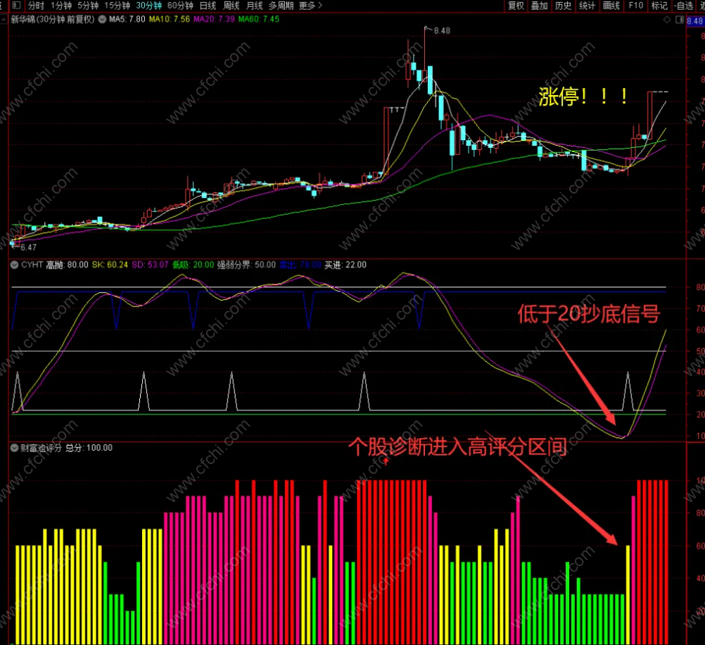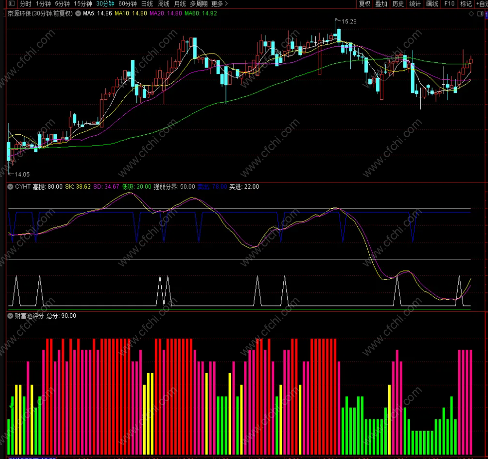 通过财富池评分指标选择热度+30分钟变盘信号个股。实现今买明卖短线操作。